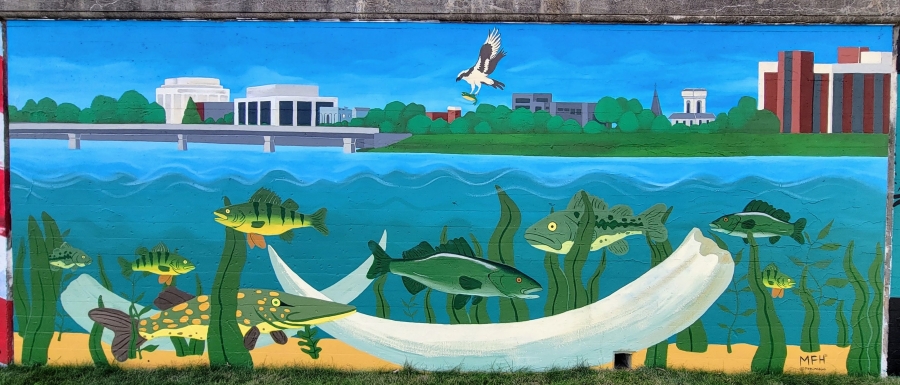 Google Map Location"Chemung River Echoes" (2019) is a public art installation on the Elmira Cultural Connector in the Second District at N. Main and Third Streets, Elmira, New York, presented by the City of Elmira with Mayor Dan Mandell and Second District Councilperson Brent Stermer, along with Community Arts of Elmira/Elmira Infinite Canvas, featuring Commissioned Artists Barbie the Welder, who created the sculptures of the ospreys and eagles, and Derek Chalfant, who engraved the indigenous river fish on the bluestone rock, as well as oversaw the inscription of the inspirational sidewalk quotations that help to tell Elmira's special story. Image Credit: KoLo (2019); Project Research Collaborators: Community Arts of Elmira/Elmira Infinite Canvas, Friends of the Chemung River Watershed, Retired ED Jim Pfiffer , City of Elmira Historian Diane Janowski; Project Engineers and Architects: Fisher Associates (Rochester, NY) and Trowbridge Wolf Michaels Landscape Architects (Ithaca, NY)