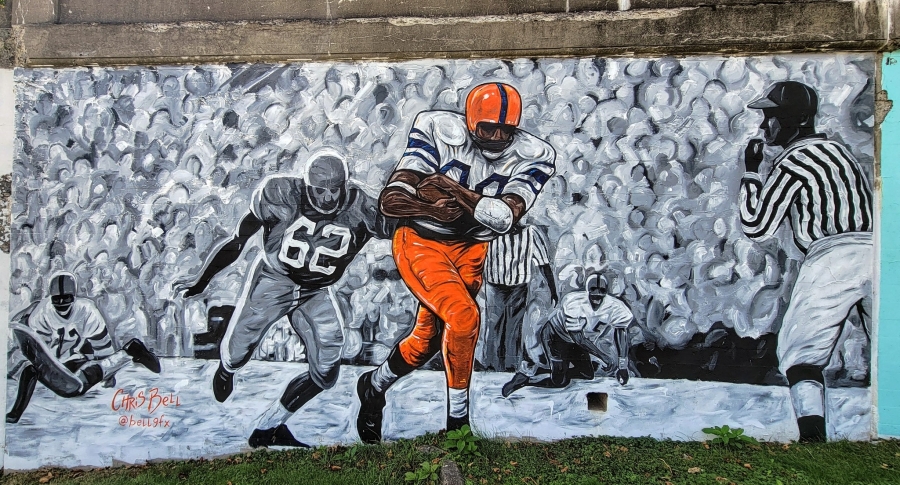 Google Map Location"Ernie Davis" by Ernie Davis Academy Arts Educator Emily Solometo and the Creative Arts Class Ninth-Grade Students, Located at New York Sport & Fitness, 134 W. Water Street, Elmira, New York, 14901. Presented by the Elmira City School District - Ernie Davis Academy - Arts Educator Emily Solometo and Creative Arts Class Students, GST BOCES Career and Development Council, New York Sport & Fitness, The Rockwell Museum (Consultant) and Community Arts of Elmira - Elmira Infinite Canvas (Consultant and Promotional Partner). Similar to the "Joel Stephens" mural (June 2019) mural at this site, the "Ernie Davis" mural is a tribute mural to honor and memorialize a native Elmiran who was an outstanding star athlete and highly-respected individual in the community. Ribbon Cutting: June 2018