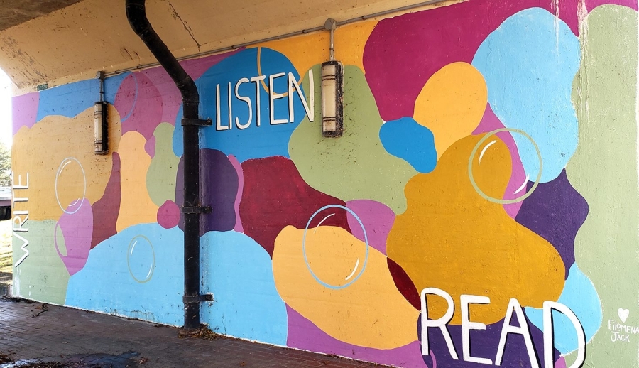 Google Map Location“Read, Write, Listen” is an abstract mural in downtown Elmira that is part of the Community Arts of Elmira Elmira "Infinite Canvas." This project was funded by a NYSCA grant with the help of the Arts Council of the Southern Finger Lakes.